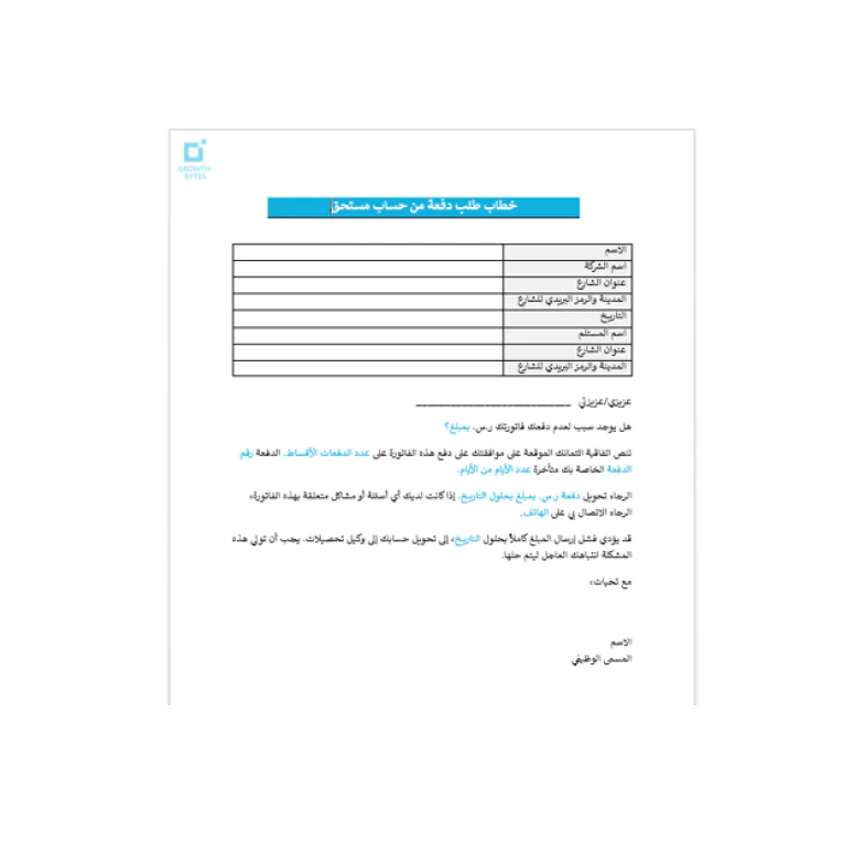 يُستخدم نموذج طلب سداد دفعة مستحقة لإعداد مطالبة مالية لأحد الزبائن/العملاء لسداد دفعة حَلَّ موعد استحقاقها في تاريخ سابق ولم تسدد.