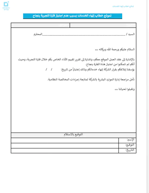 نموذج / خطاب إنهاء الخدمات هو خطاب يُستخدم عندما تريد انهاء خدمات موظف. يحتوي هذا النموذج على اكثر من خطاب حسب اسباب انهاء الخدمة، وتشمل: